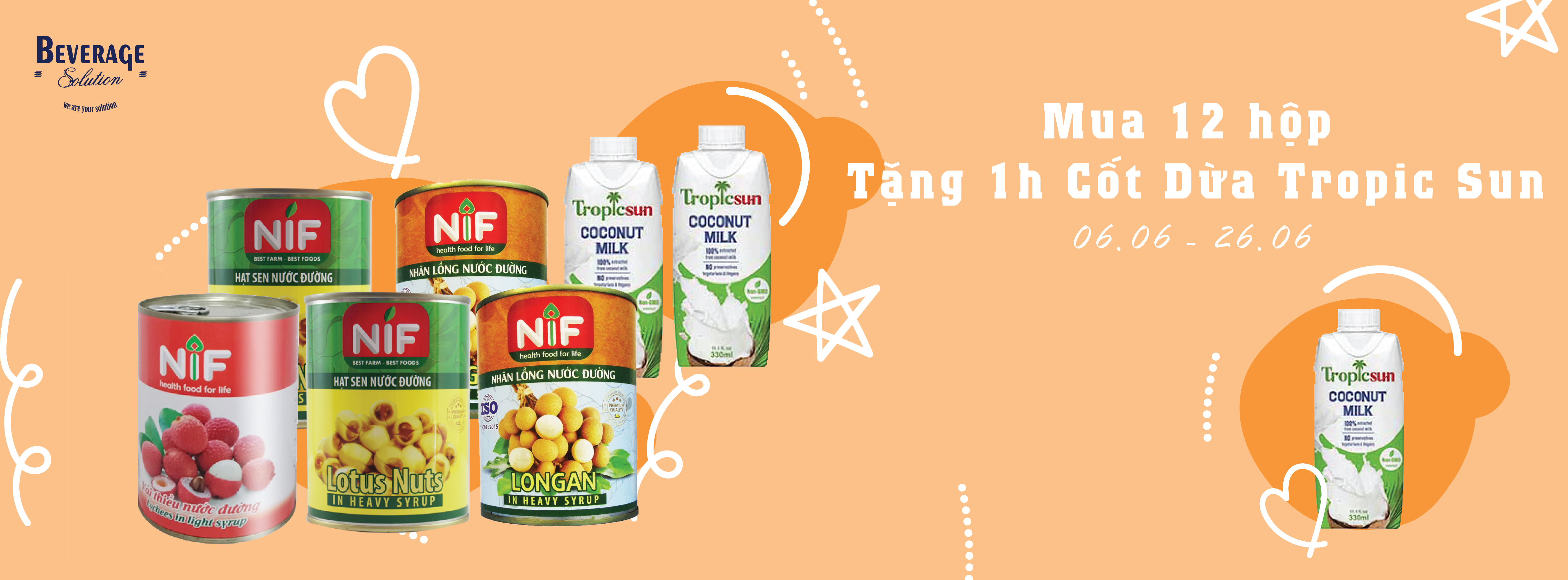 Chương trình Khuyến mãi siêu hấp dẫn từ anh em NIF. Khi mua 12 hộp nhãn ngâm NIF, sen ngâm NIF, vải ngâm NIF, nước cốt dừa Tropicsun, các khách sẽ được tặng ngay 1 hộp cốt dừa Tropicsun siêu béo ngậy và siêu thơm ngon. Với độ thơm béo không cần bàn, nuớc cốt dừa Tropicsun thích hợp cho món chè, cà phê cốt dừa, bingsu,...