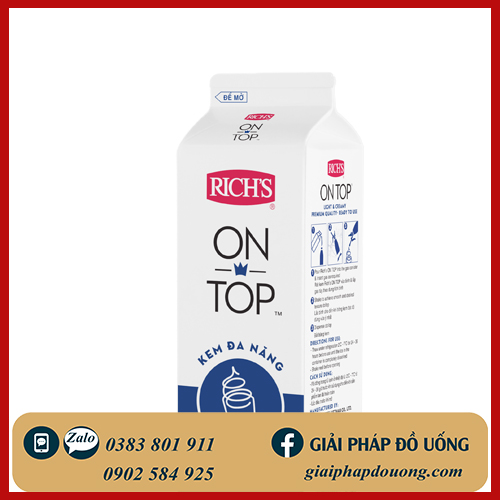 Kem Đa Năng Tiện Dụng Rich's On Top là dòng kem thực vật pha sẵng để làm whipping. Kem On Top tiện dụng, tiết kiệm chi phí, là nguyên liệu pha chế cho các món nước, làm kem và các món tráng miệng. Kem On Top sử dụng đơn giản, tháo tác nhanh chóng, sản lượng tối ưu.