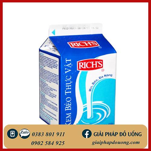 Kem Béo Thực Vật Richs là loại kem nguyên chất dạng đông lạnh có tính kháng axit, dùng để trang trí, làm topping, làm bánh và dùng như nguyên liệu pha chế thức uống.